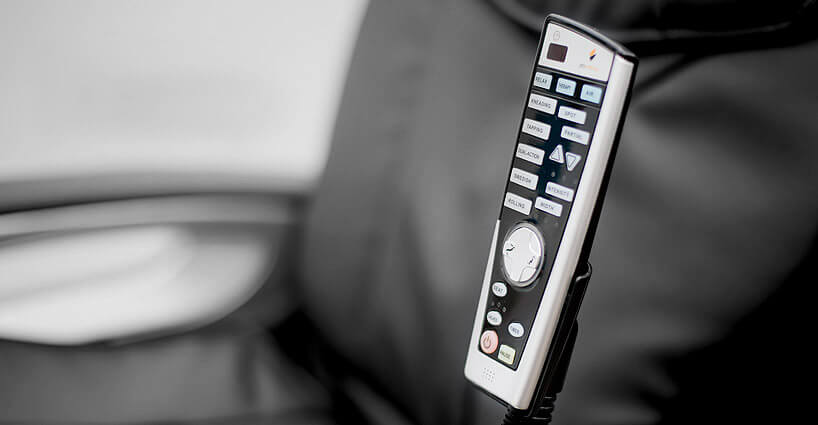 Intuicyjny pilot sterowania umieszczony jest na statywie obok podłokietnika. Pilot zapewnia łatwy dostęp do wszystkich funkcji fotela oraz wyświetla pozostały czasu masażu.