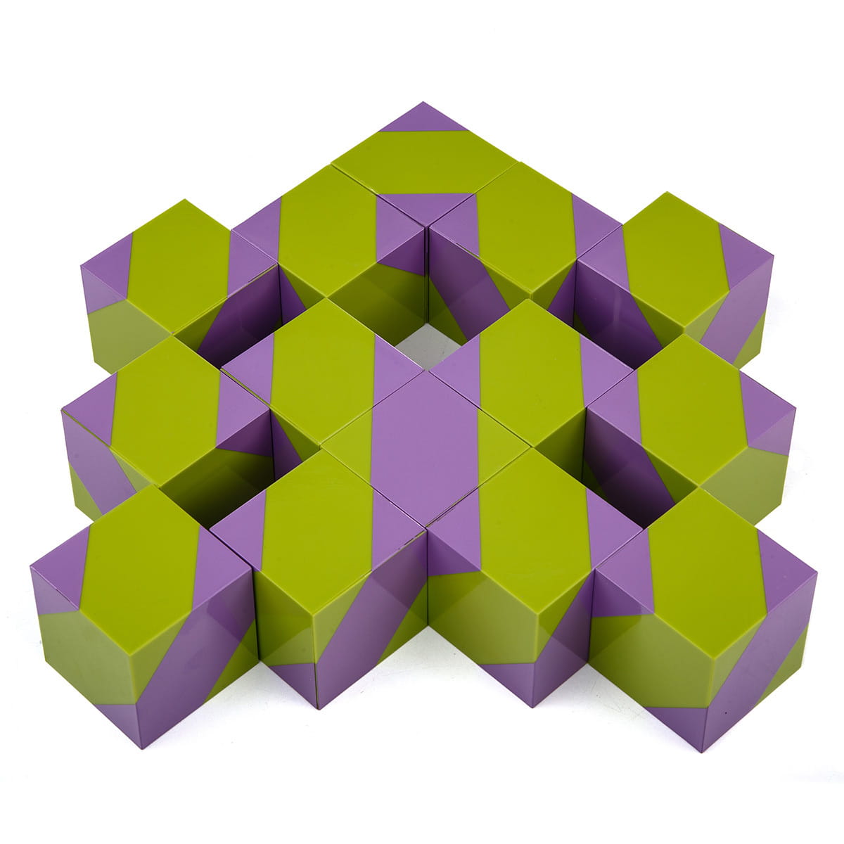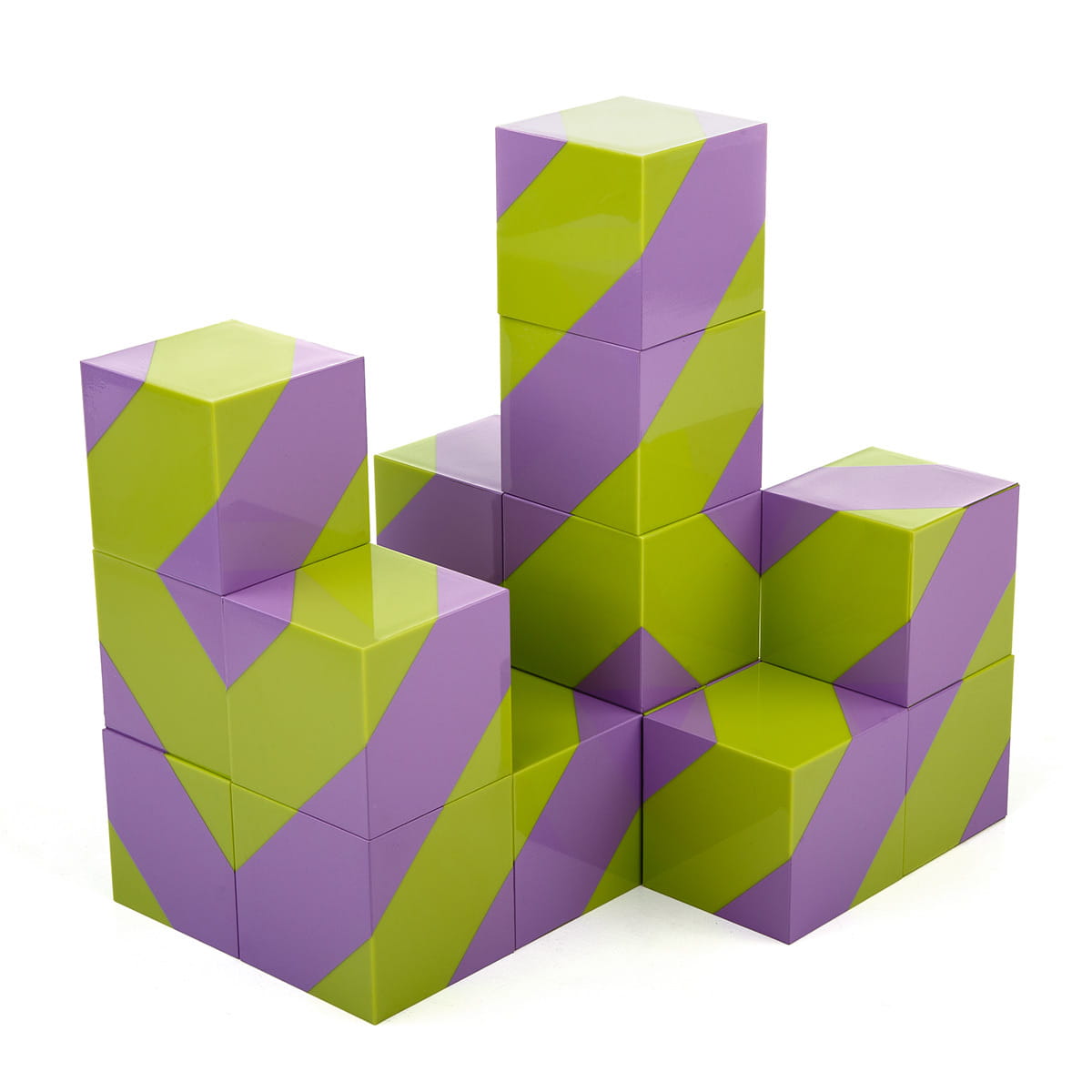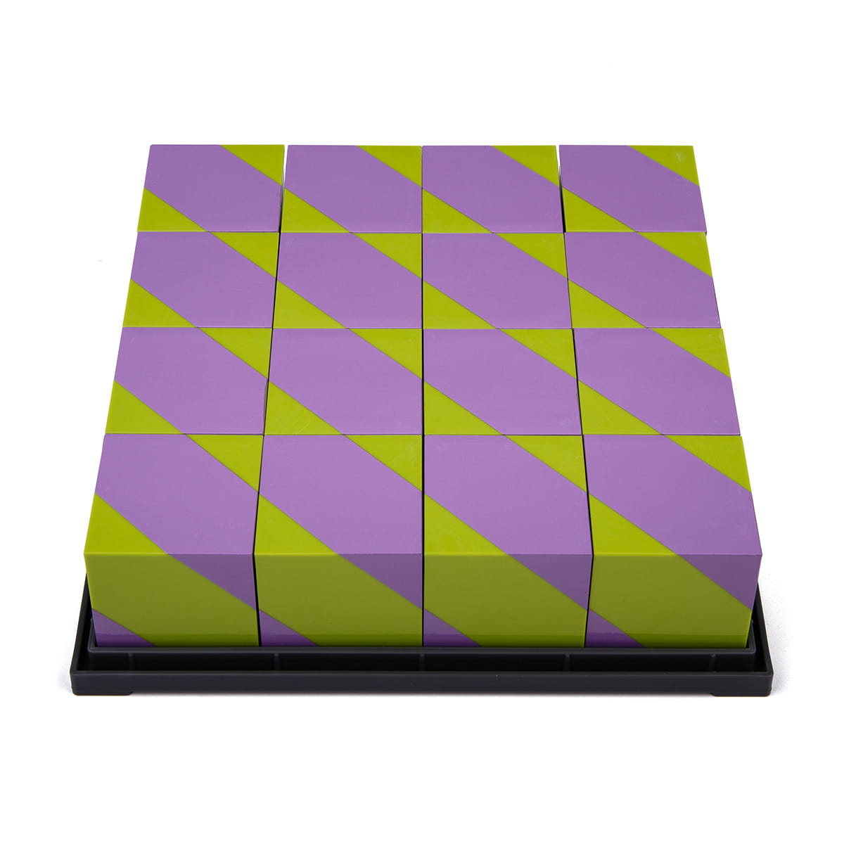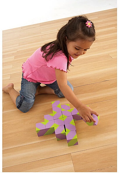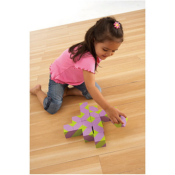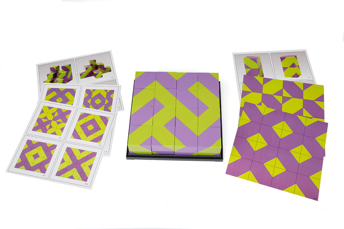 zawartość zestawu: 16 klocków, 6 dwustronnie zadrukowanych kart z przykładowymi wzorami do ułożenia, przewodnik, plastikowe pudełko do przechowywania