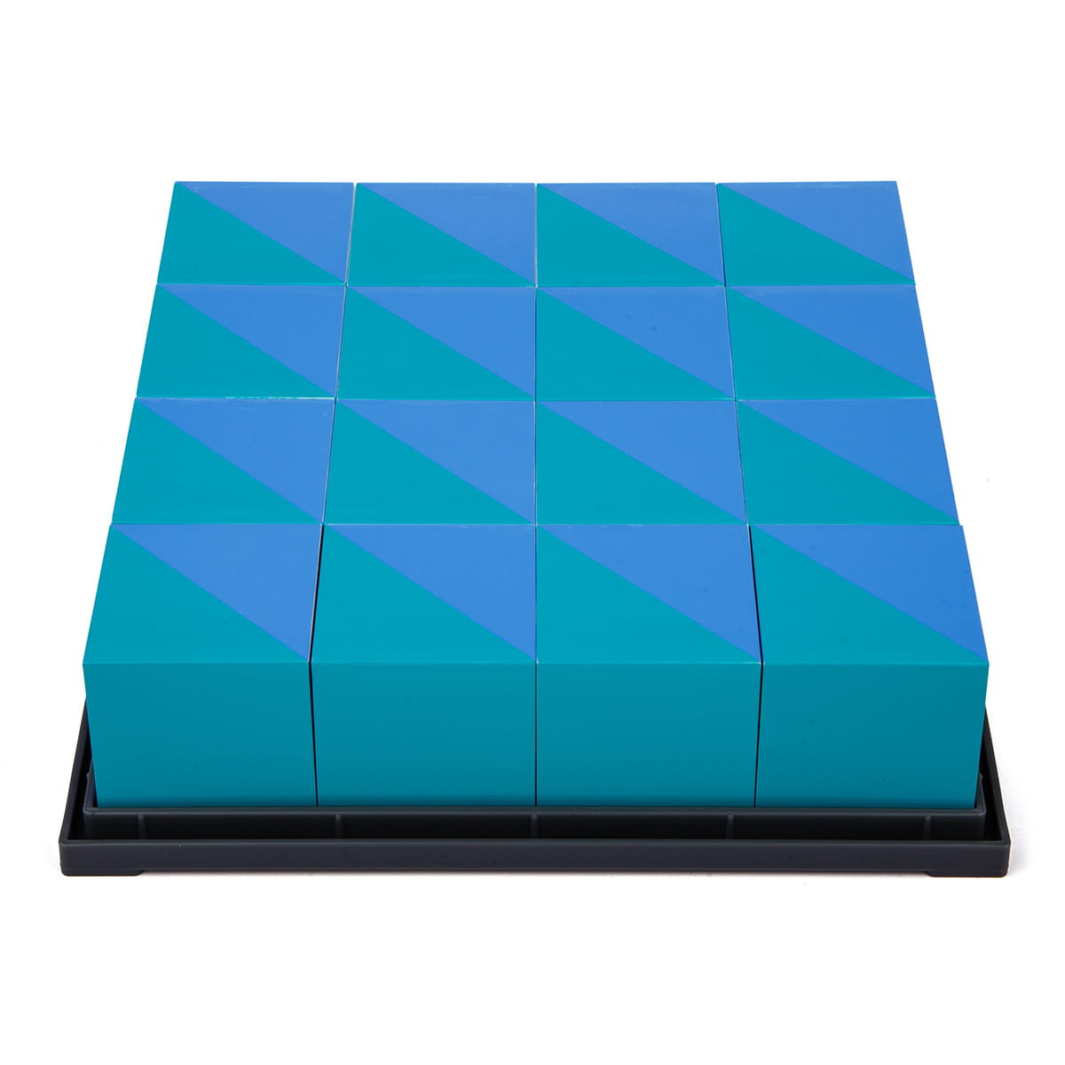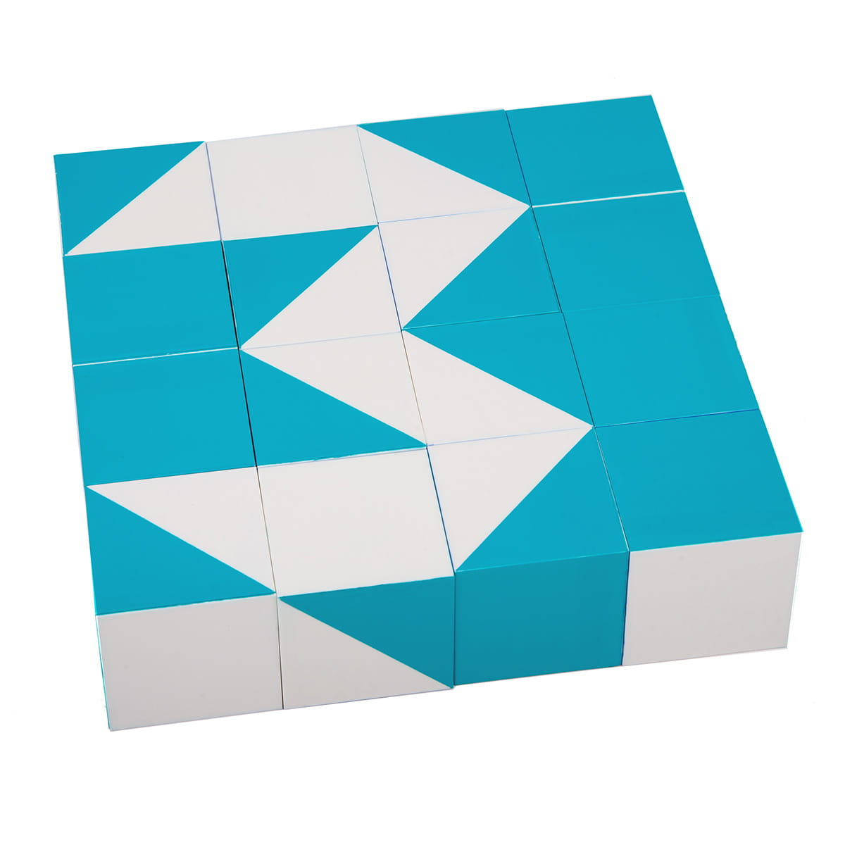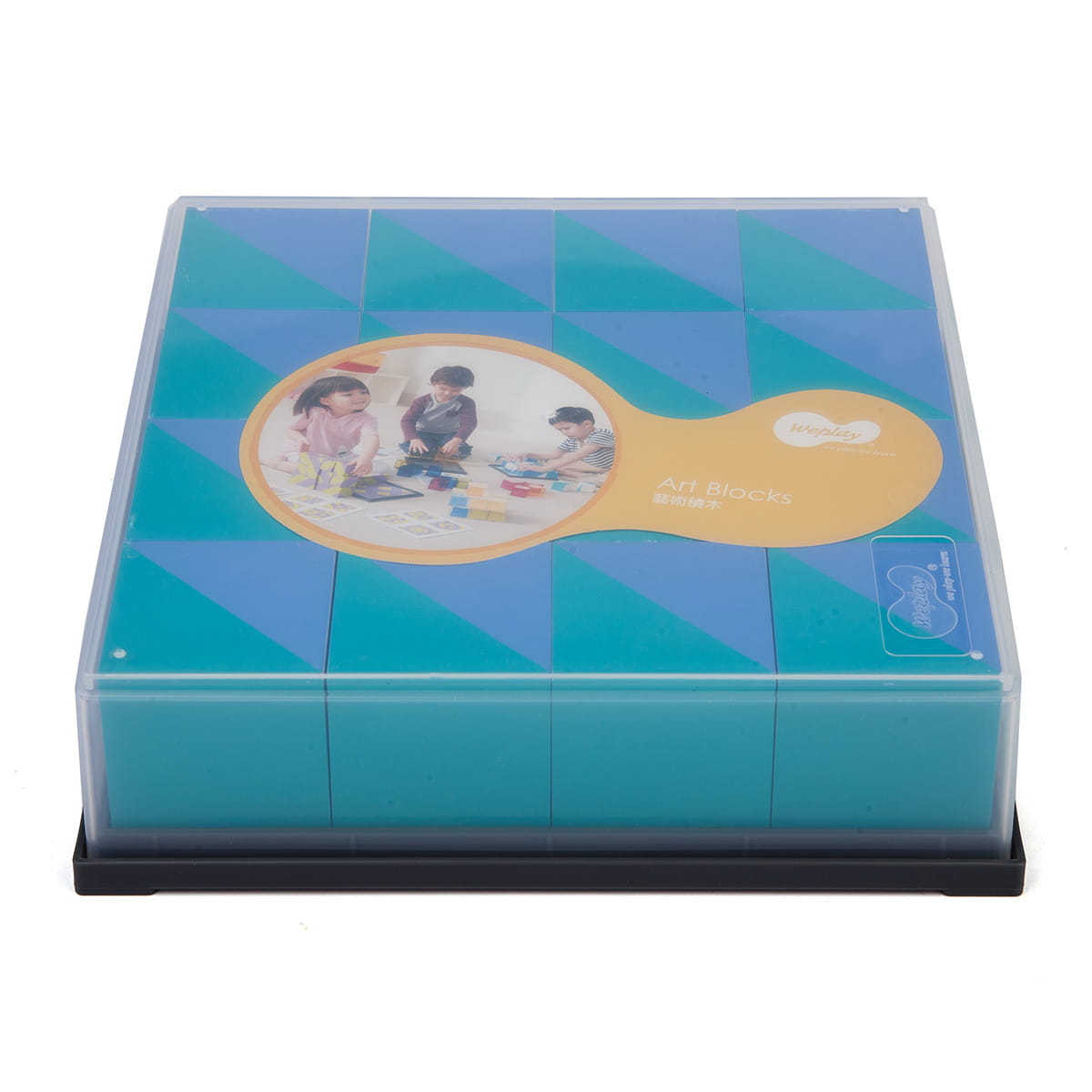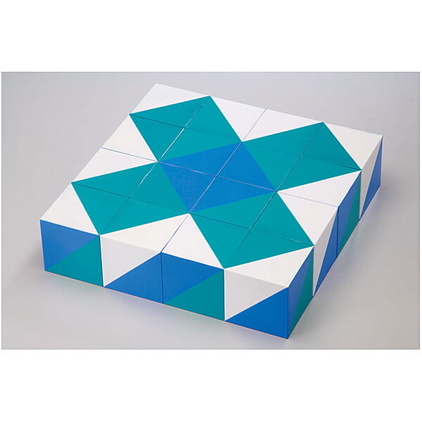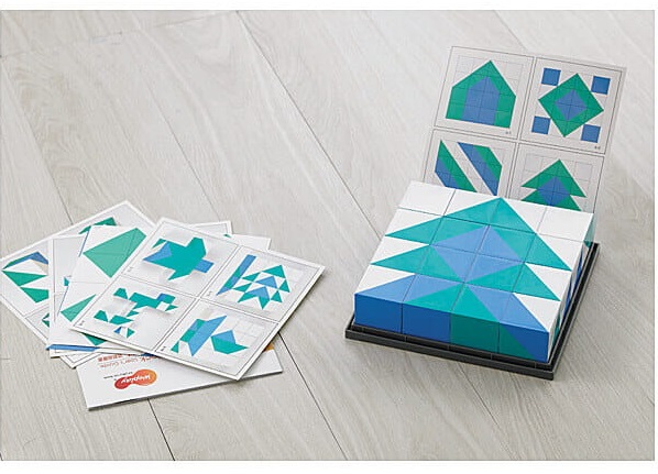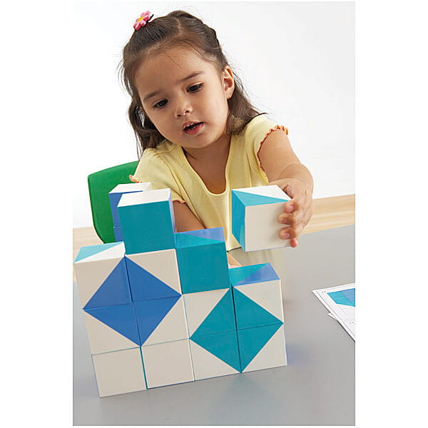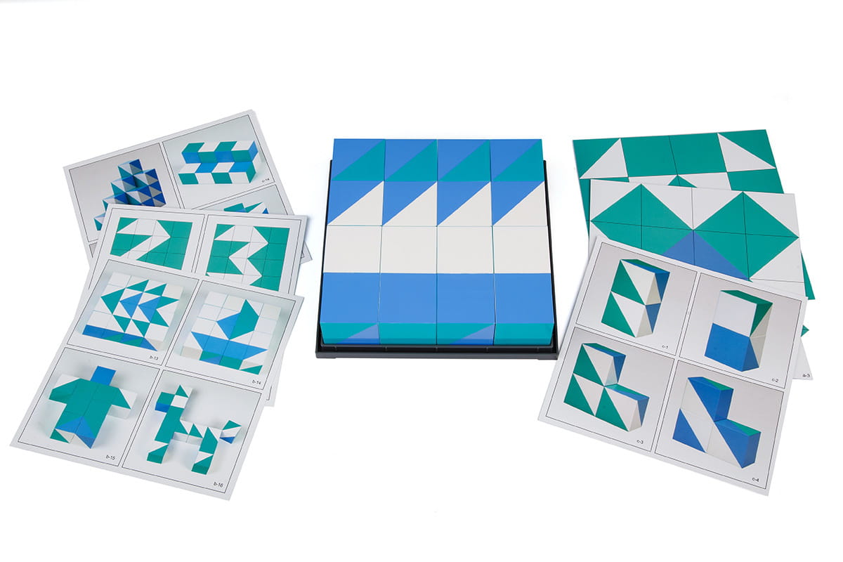 zawartość zestawu: 16 klocków, 6 dwustronnie zadrukowanych kart z przykładowymi wzorami do ułożenia, przewodnik, plastikowe pudełko do przechowywania