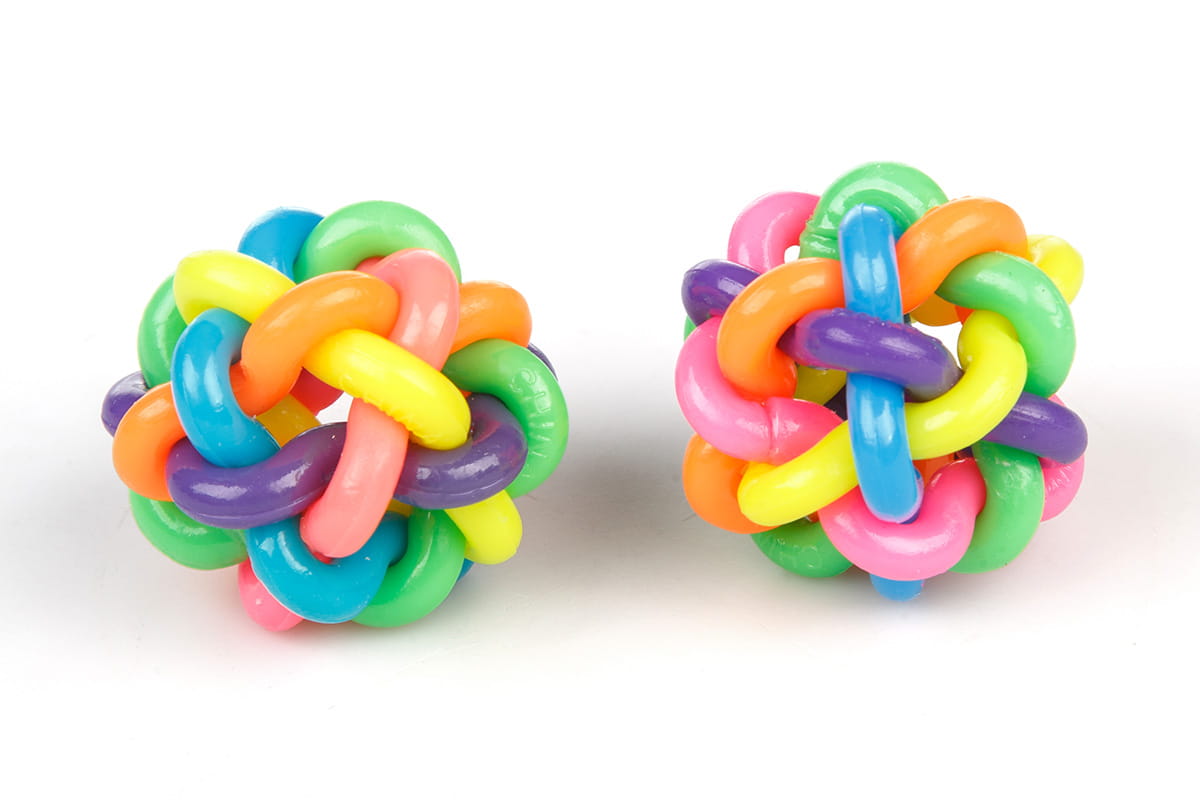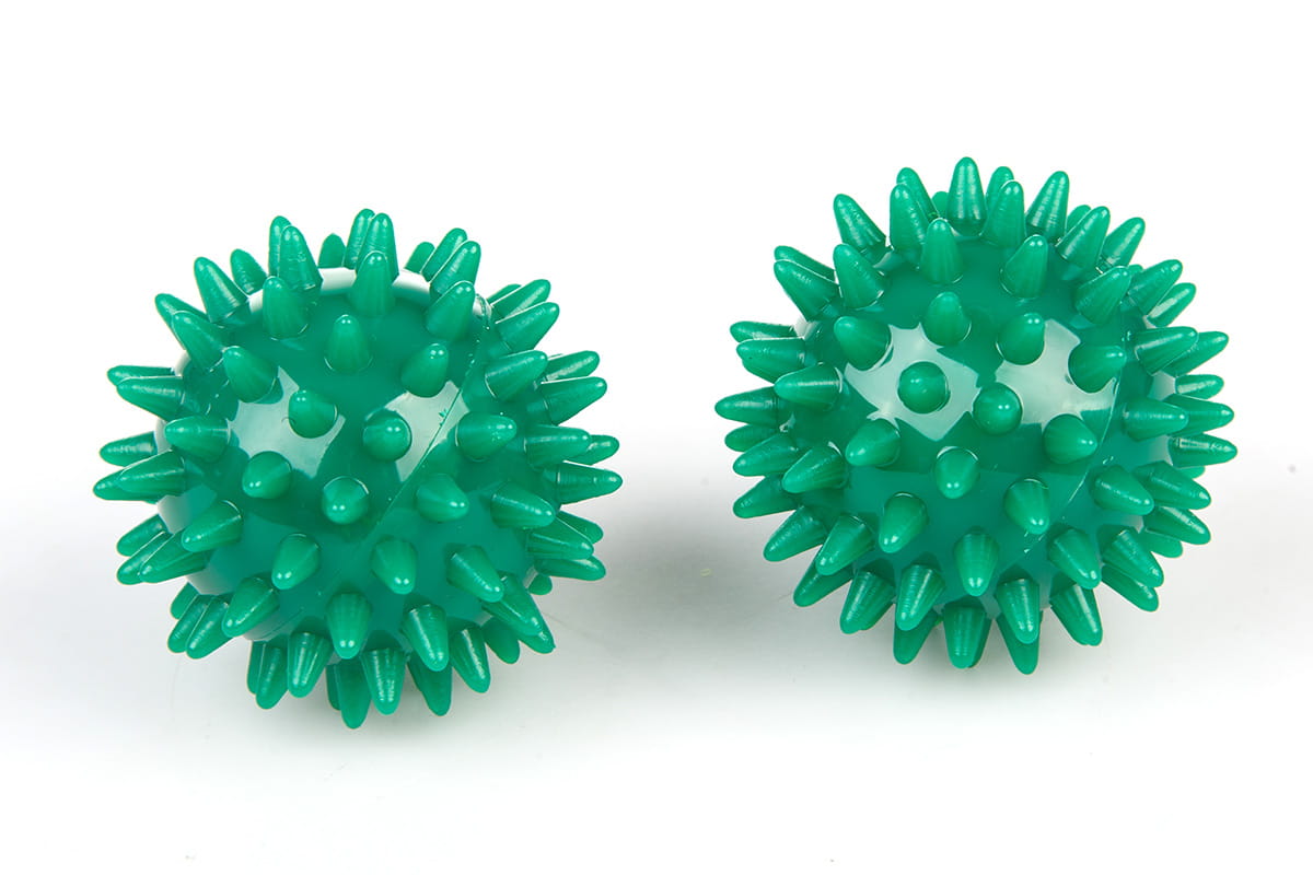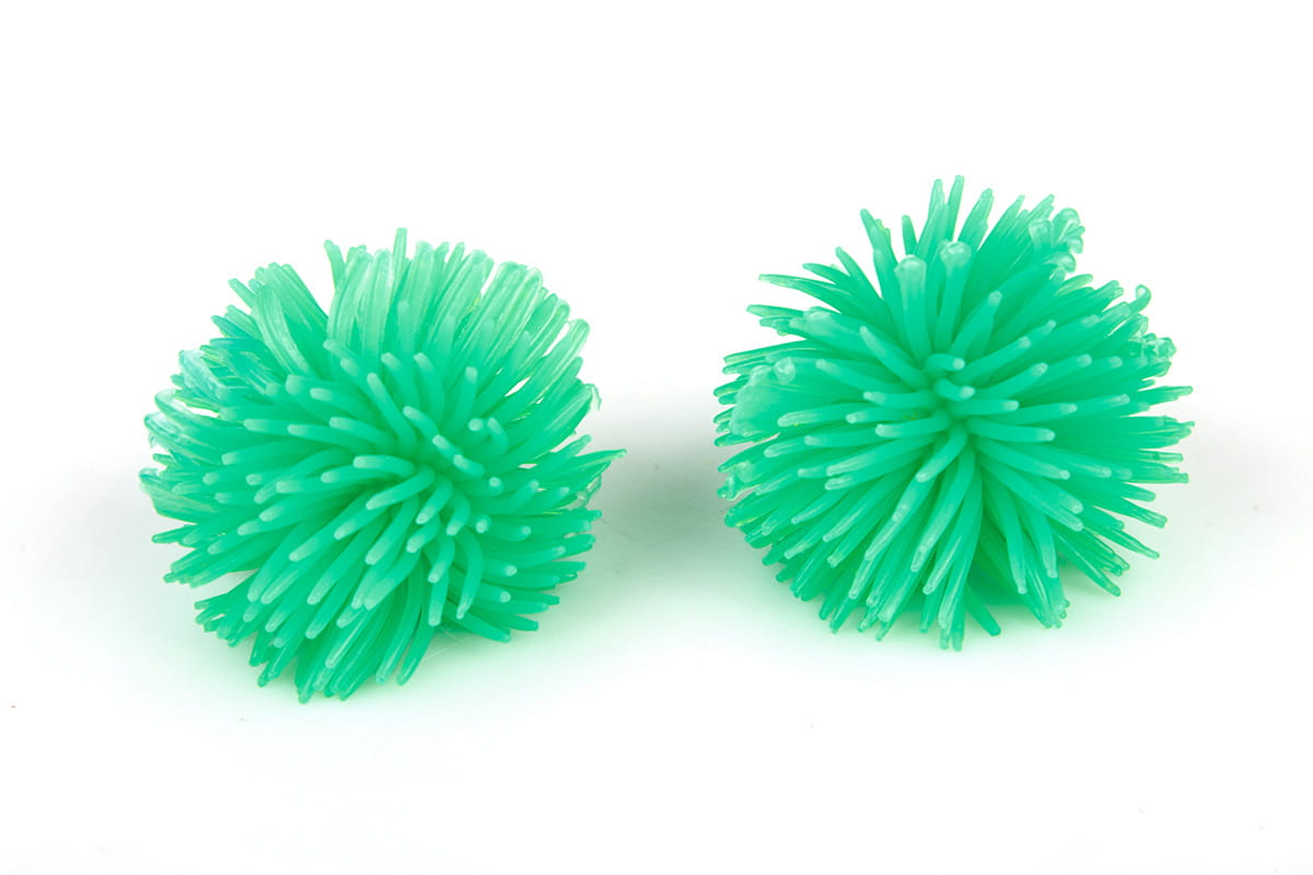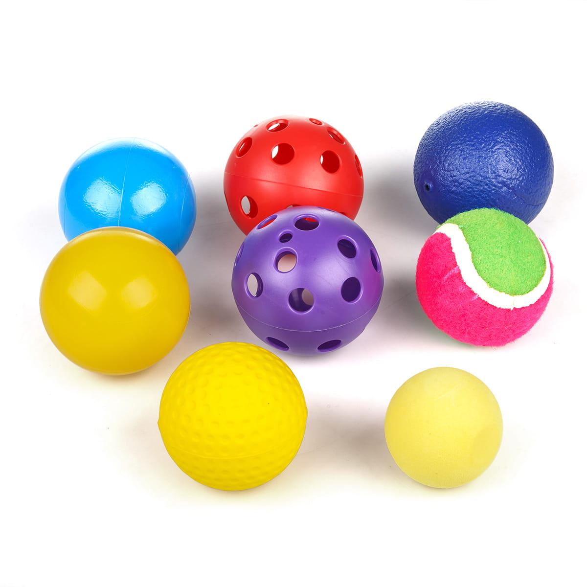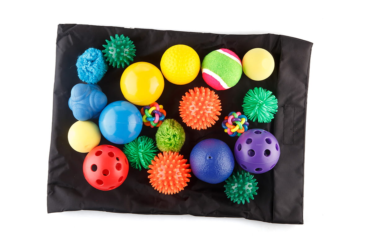 Komplet 20 piłek sensorycznych o różnych fakturach, kolorach, gęstości i właściwościach odbijania. Kulki są dostarczane w czarnej torebce.