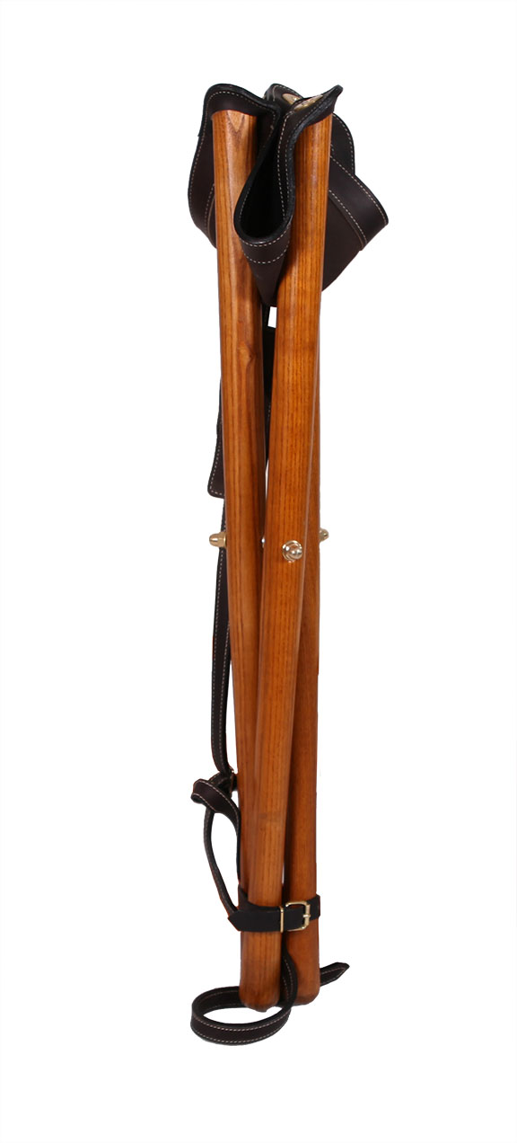 Trójnóg można w bardzo prosty i szybki sposób złożyć i owinąć skórzaną opaską w pozycji złożonej.