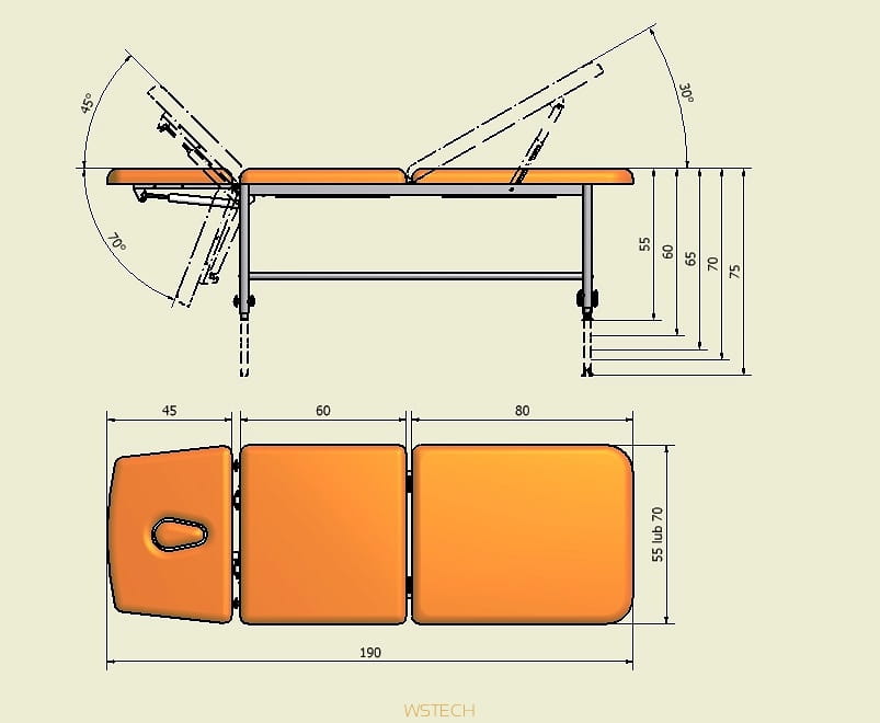 - Łatwe utrzymanie czystości – powierzchnia leżanki pokryta antybakteryjnym materiałem, łatwa do dezynfekcji.