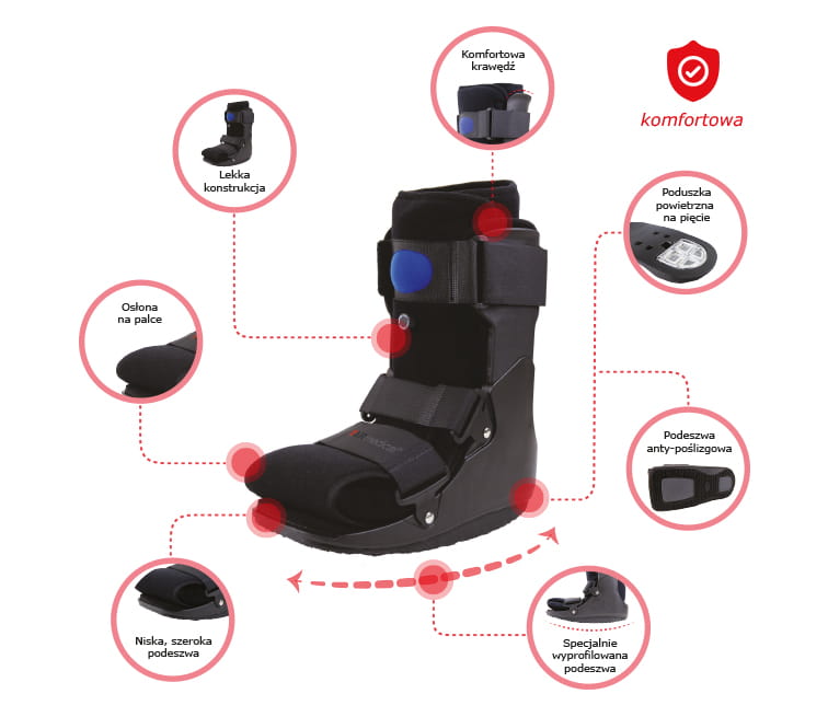 Stanowi doskonałą alternatywę do tradycyjnego unieruchomienia gipsowego, zdecydowanie poprawiając komfort użytkowania. Dzięki zintegrowanej pompce gwarantuje dostosowanie kompresji do stanu chorobowego pacjenta, redukując możliwość wystąpienia krwiaków oraz obrzęków. Gwarantuje możliwość regularnej oceny wizualnej kontuzji oraz utrzymanie kończyny w należytym stanie higienicznym. Dzięki lekkiej konstrukcji Walker Basic nie obciąża kończyny, a zastosowana miękka wyściółka pneumatyczna gwarantuje wysoki komfort użytkowania.