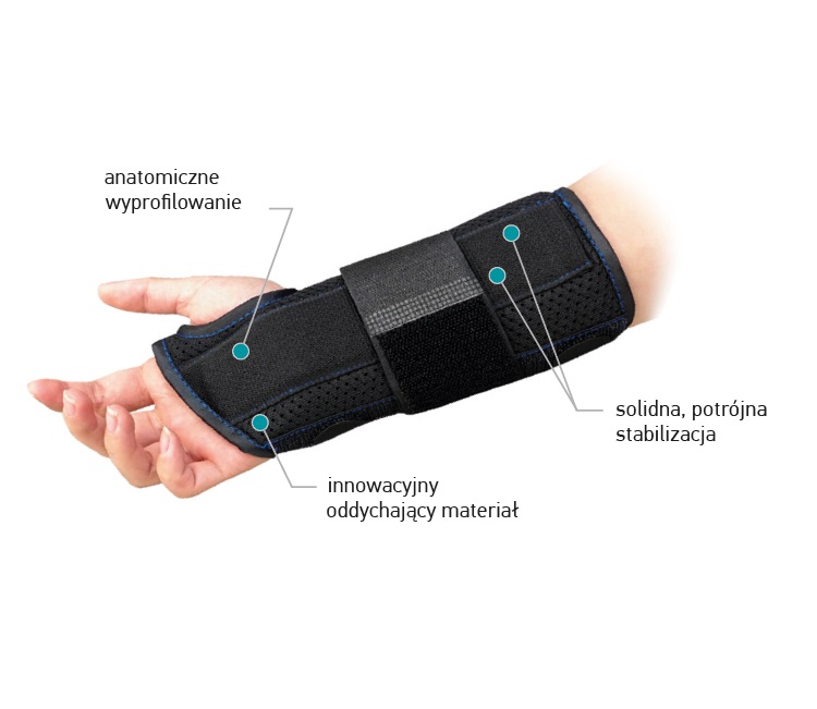 - Skuteczna stabilizacja nadgarstka – dwa solidne elementy usztywniające zapewniają wysoki poziom unieruchomienia