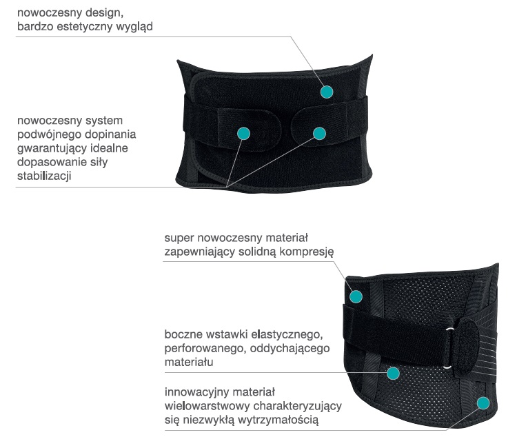 - Cztery stalki i dwie fiszbiny w tylnej części pasa – zapewniają skuteczną stabilizację i wsparcie dla odcinka lędźwiowego.