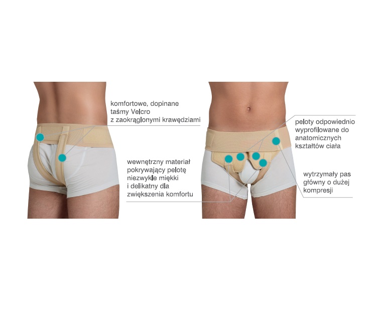 Materiał pokrywający peloty od strony skóry jest miękki, delikatny i oddychający, dzięki czemu skutecznie odprowadza ciepło i wilgoć, minimalizując ryzyko podrażnień. Dopinane taśmy pachwinowe z Velcro mają wąskie, zaokrąglone krawędzie dla maksymalnego komfortu użytkowania. Pas główny jest wytrzymały i zapewnia dużą kompresję, utrzymując wyrób na właściwej pozycji. Specjalnie wyprofilowane peloty dopasowują się do anatomicznej budowy ciała, oferując optymalne właściwości terapeutyczne. Nowoczesny system zapinania gwarantuje idealne przyleganie, komfort i solidną stabilizację podczas codziennego użytkowania.