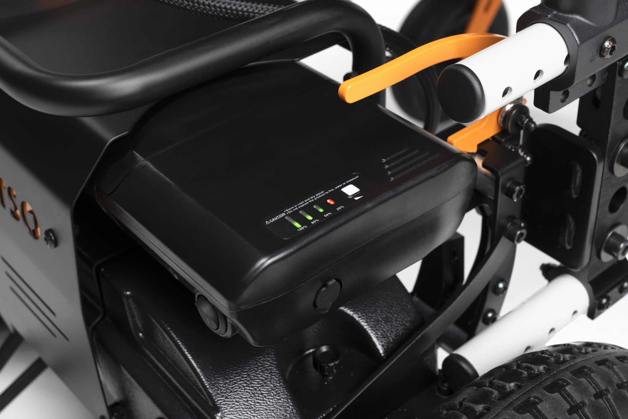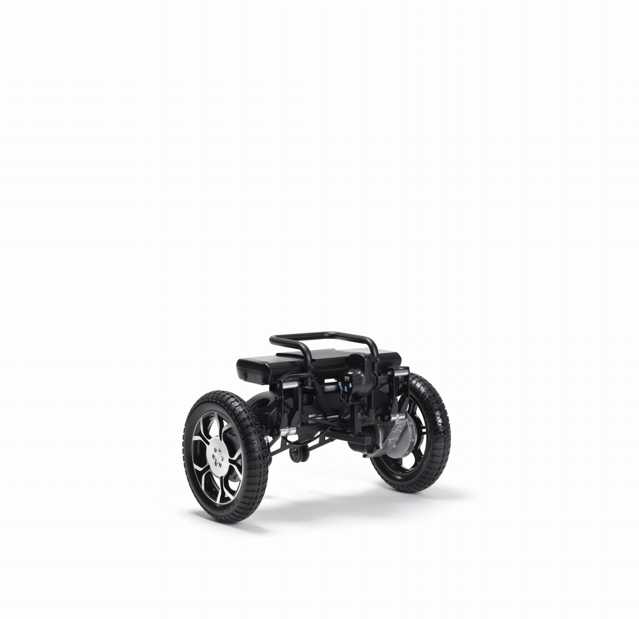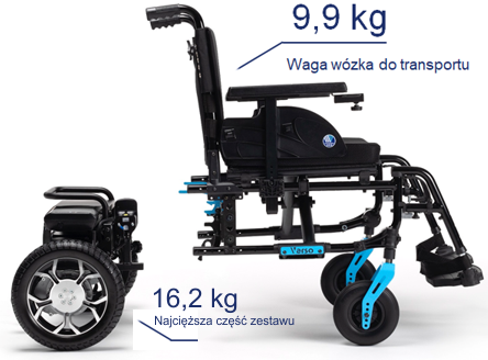 Po odłączeniu napędu od ramy wózka , co zajmuje kila sekund mamy dwa elementy do załadowania do bagażnika auta napę wraz baterią , które waż 16 kg i ramę wózka , która waży 9,9 kg. To najłatwiejszy i najlżejszy wózek do załadowania do transportu nawet w małym aucie.