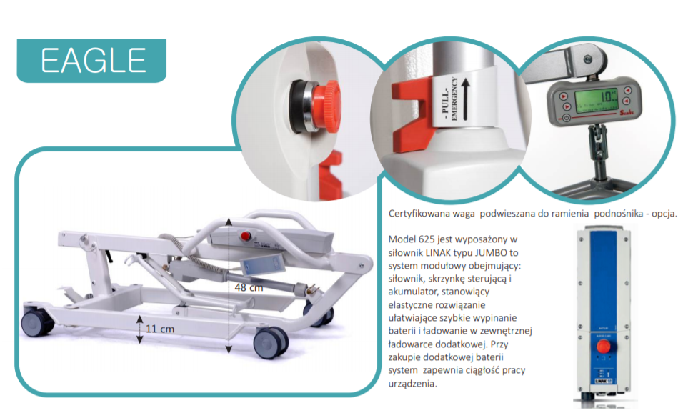 Podnośnik kąpielowo-transportowy EAGLE 625 to połączenie bezpieczeństwa, wygody i niezawodności. Jego ergonomiczna konstrukcja i wysoki udźwig czynią go idealnym wyborem zarówno dla opiekunów, jak i osób korzystających z podnośnika. Inwestując w EAGLE 625, zyskujesz produkt, który ułatwia codzienną pielęgnację, zapewnia komfort pacjentowi i minimalizuje ryzyko kontuzji dla opiekuna.