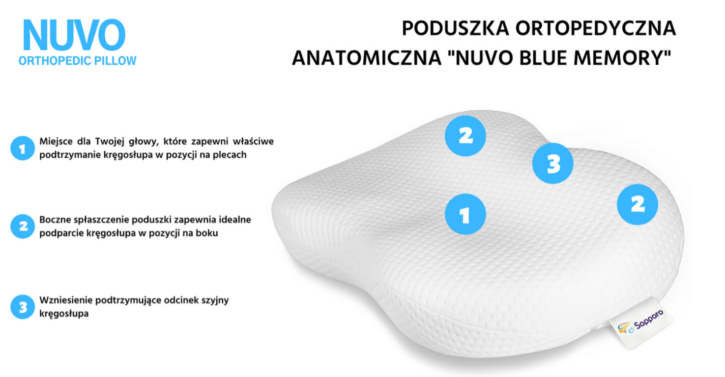 Poduszka ortopedyczna Nuvo firmy drSapporo to nowoczesna, dwustronna poduszka ortopedyczna klasy I – certyfikowany wyrób medyczny, który spełnia rygorystyczne europejskie normy jakości. Została zaprojektowana z myślą o osobach, które oczekują maksymalnego komfortu snu oraz prawidłowego podparcia głowy, szyi i kręgosłupa w fizjologicznej pozycji.