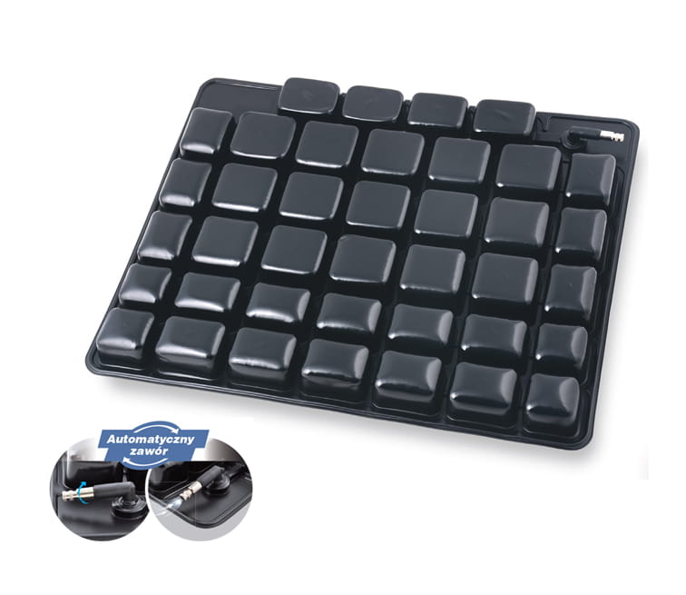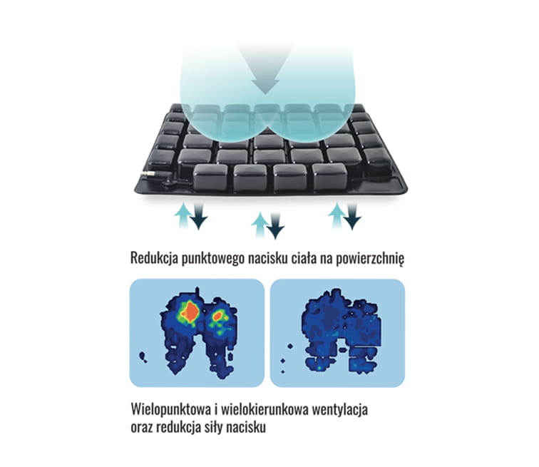 Niezależne komory połączone są w jeden system powietrzny, dzięki czemu umożliwią balans ciała. Nacisk na wybrną komorę, powoduje wzrost ciśnienia w sąsiedniej komorze i tym samym odciążenie poszczególnych części ciała. Dzięki zastosowaniu odpowiedniej technologii zgrzewania poduszka przeciwodleżynowa nie rozszczelnia się.