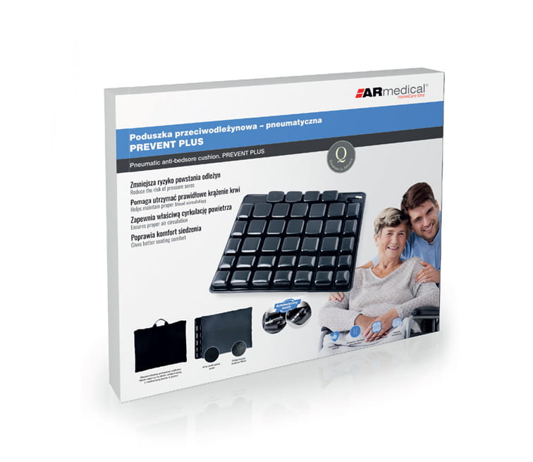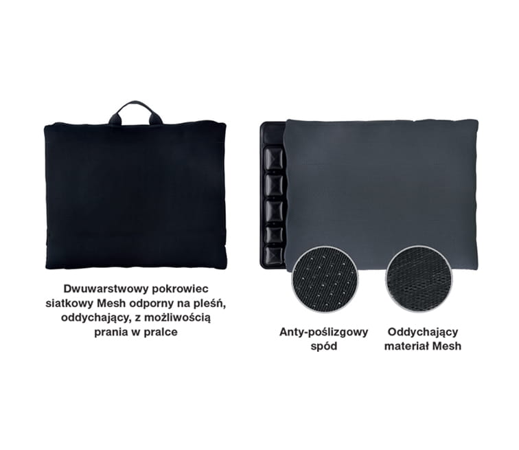 Poduszka przeciwodleżynowa wyposażona w przewiewny pokrowiec zapinanym na suwak, wykonany z materiału siatkowego Mesh, z anty-poślizgowym spodem. Wygodny uchwyt umożliwia łatwe jej przenoszenie. Wyposażona ponadto w dodatkowe rzepy umożliwiające trwałe zamocowanie poduszki np. na wózku inwalidzkim.
