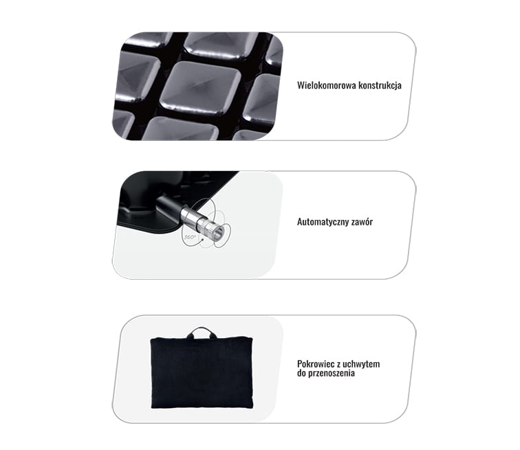 Specjalna wielokomorowa konstrukcja oraz możliwość zmiany twardości poprzez dopompowanie lub upuszczenie powietrza gwarantują wysoki komfort użytkowania. Zastosowanie automatycznego zaworu umożliwia w dowolnej chwili zmianę twardości poduszki w zależności od preferencji użytkownika. Wykonana jest z wysokiej jakości tworzywa odpornego na nacisk.