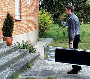 - Lekka i mobilna konstrukcja — rampa składa się w poręczną „walizkę” i po złożeniu nie jest większa ani bardziej nieporęczna od zwykłej walizki. Dzięki temu łatwo ją przenosić i przechowywać.