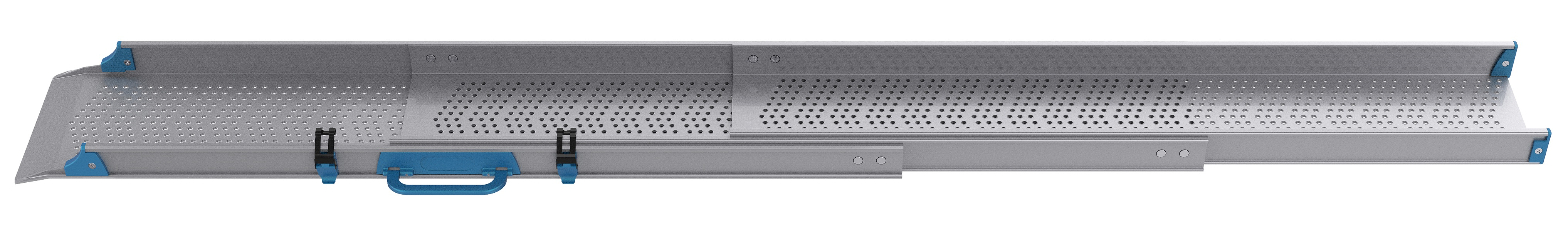 - Transport i przechowywanie: teleskopowy mechanizm, blokada transportowa i ergonomiczne uchwyty — rampa jest łatwa do przeniesienia i kompaktowa po złożeniu.