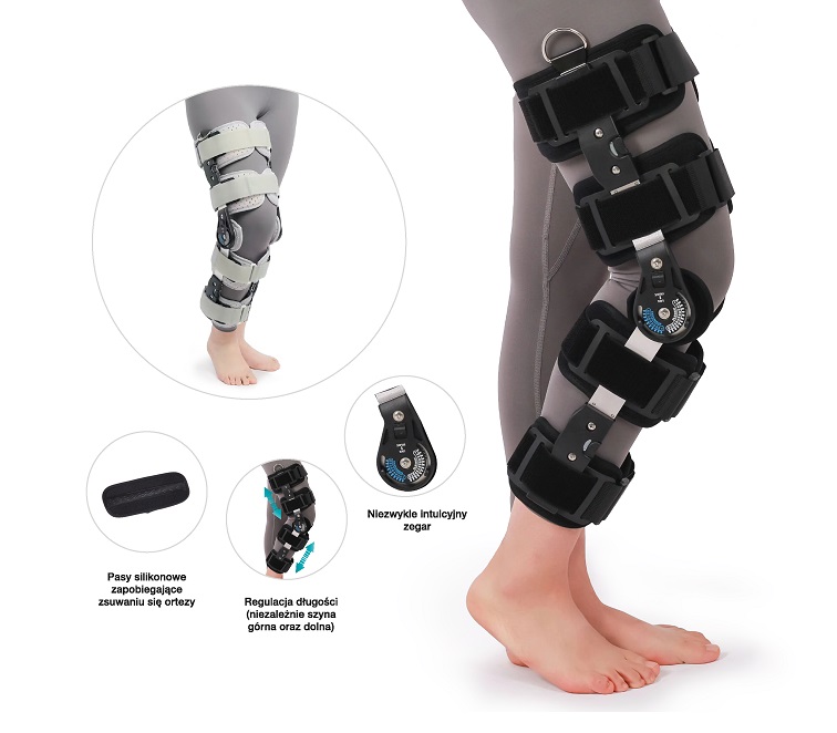 Zastosowany mechanizm zegarowy pozwala na dokładną kontrolę zakresu ruchu stawu, co jest kluczowe w procesie rehabilitacji. Umożliwia stopniowe zwiększanie lub ograniczanie ruchomości zgodnie z zaleceniami lekarza lub fizjoterapeuty.
