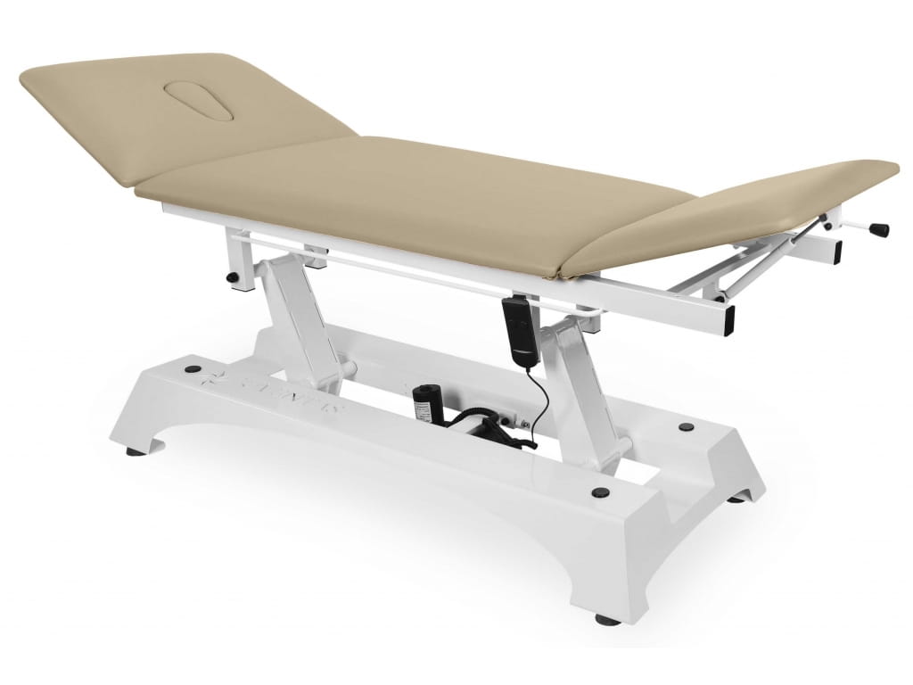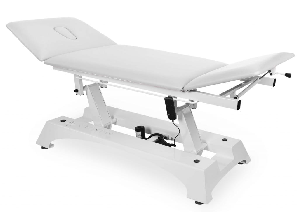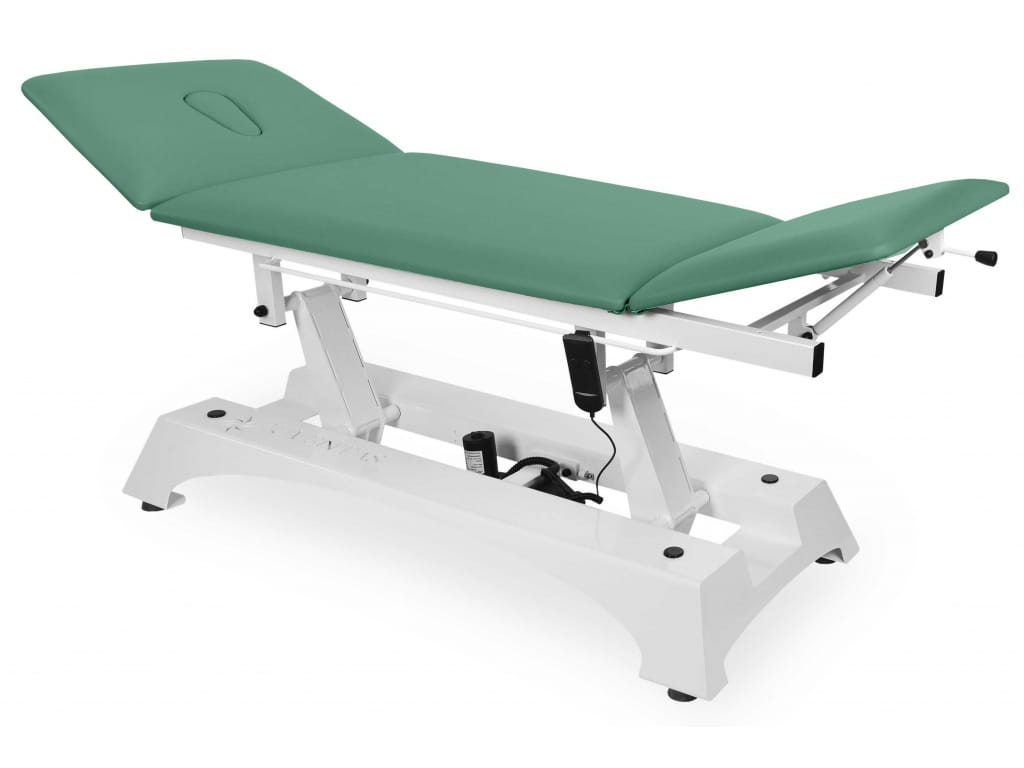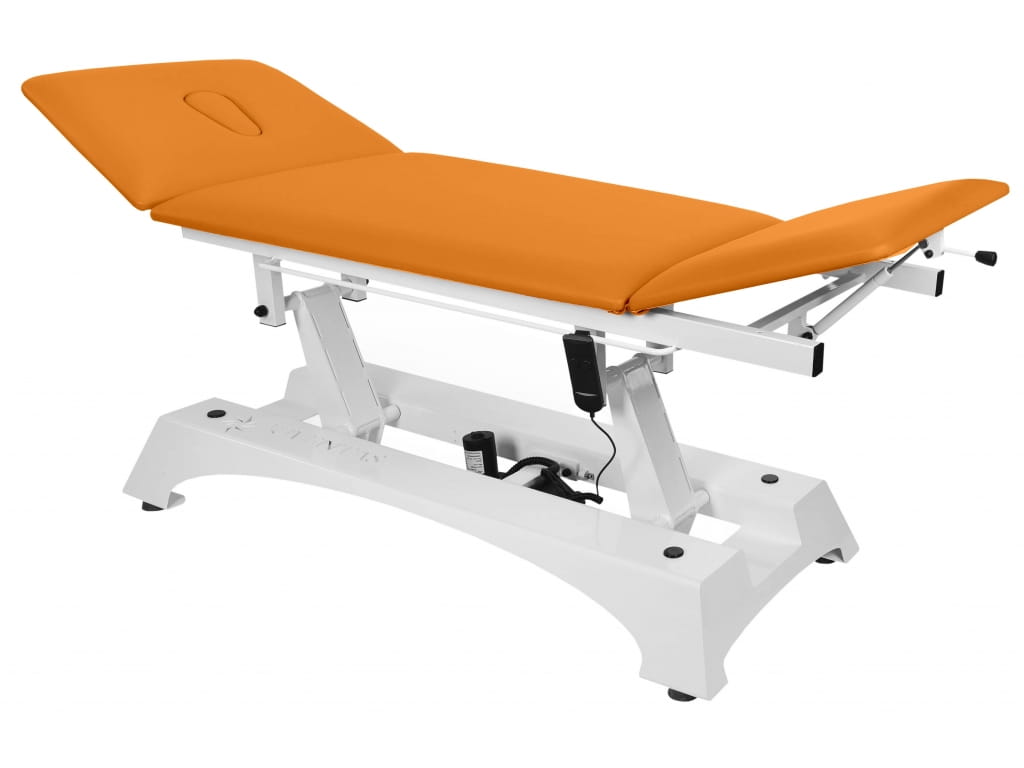 - Regulacja wysokości elektryczna – płynna i cicha zmiana wysokości stołu umożliwia dopasowanie pozycji do potrzeb pacjenta i terapeuty.