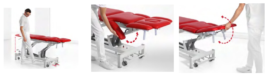 | Wysokiej jakości wykończenie | Regulowane stopki | Kąt regulacji zagłówka | Kąt regulacji sekcji nożnej | Wymiary każdej sekcji stołu |