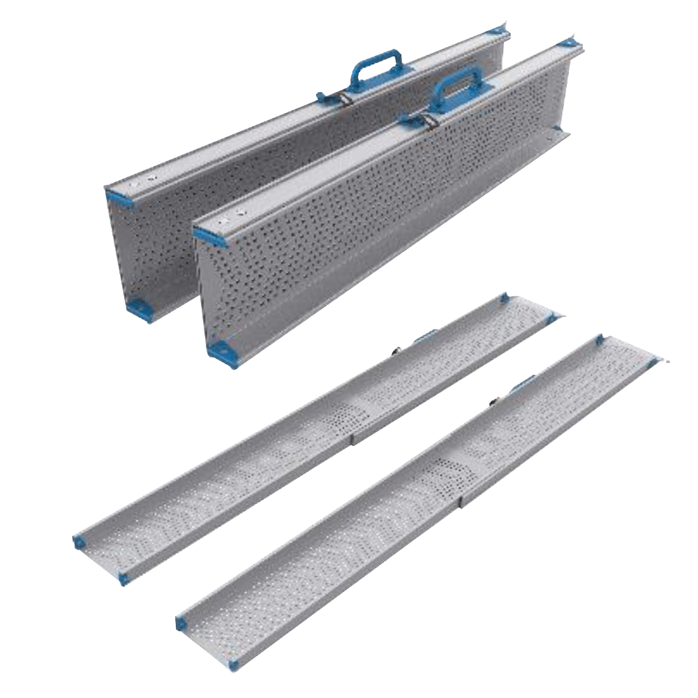 - Funkcjonalność transportowa – dzięki ergonomicznym uchwytom i blokadom transportowym rampy są łatwe do przenoszenia i zabezpieczone przed przypadkowym rozłożeniem.