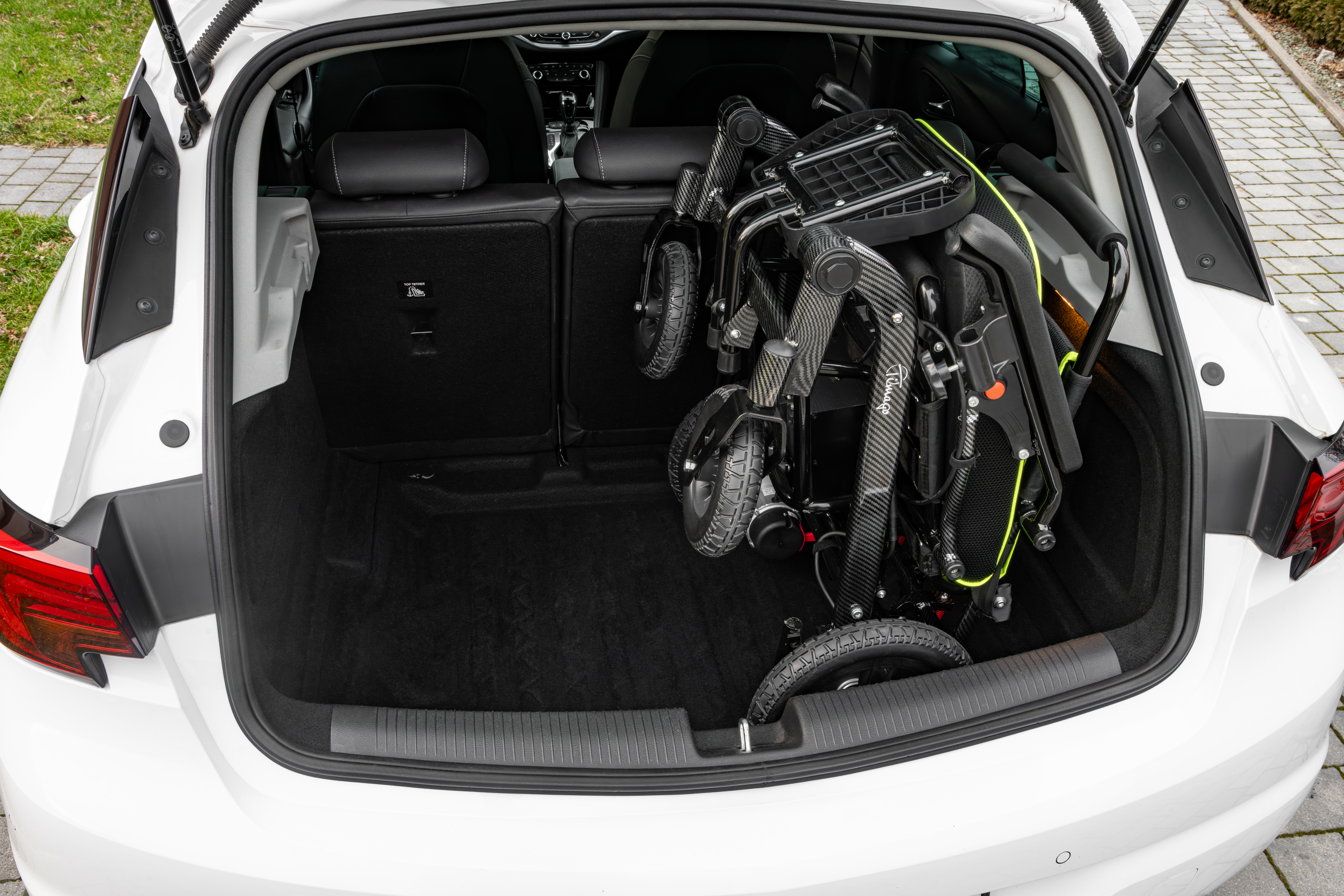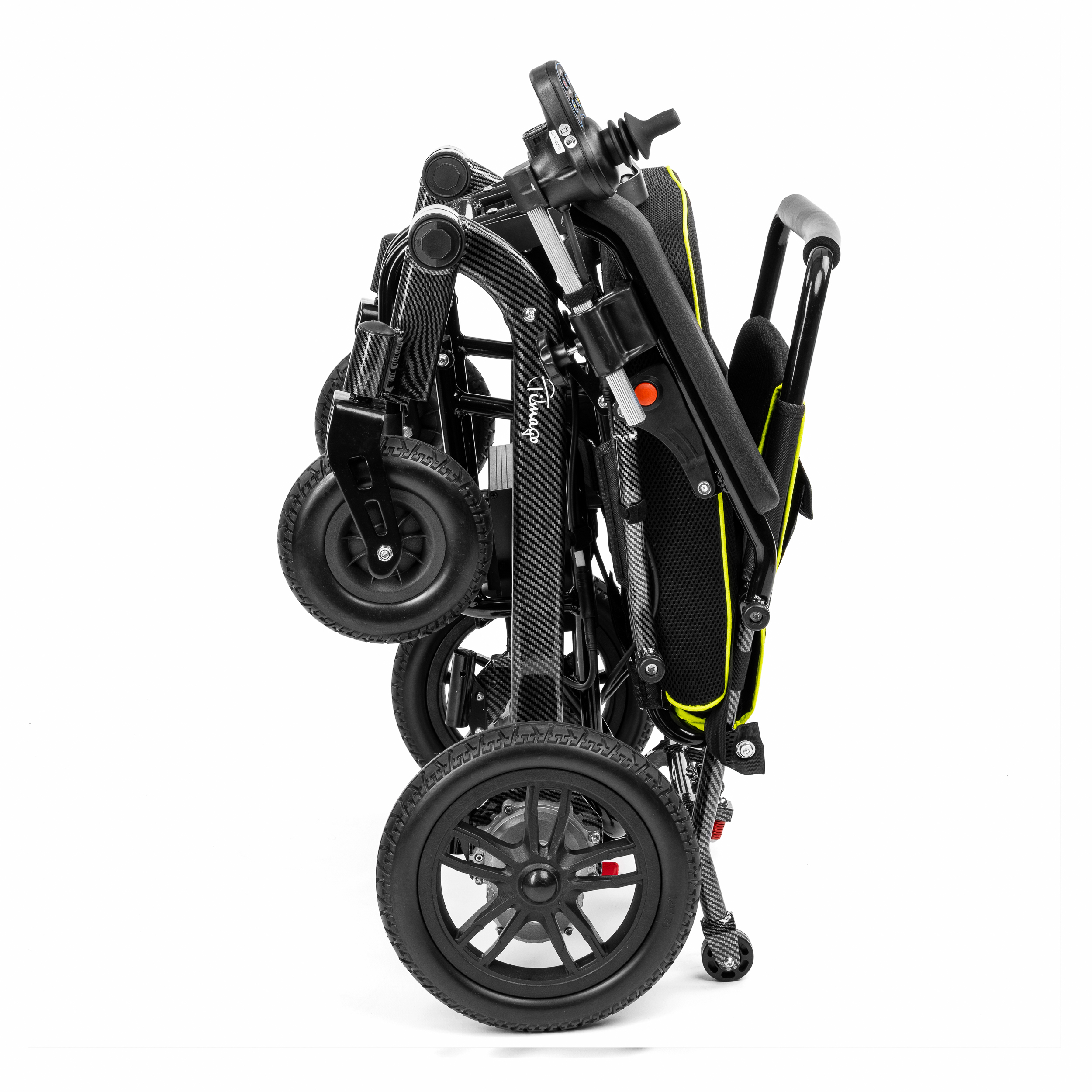 - Praktyczne dodatki – Zdejmowalny, bezobsługowy akumulator, kieszeń na drobiazgi oraz pasek zabezpieczający złożony wózek.