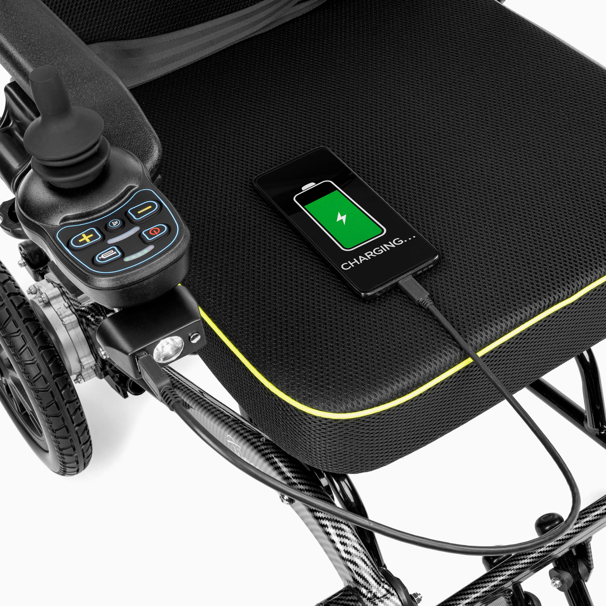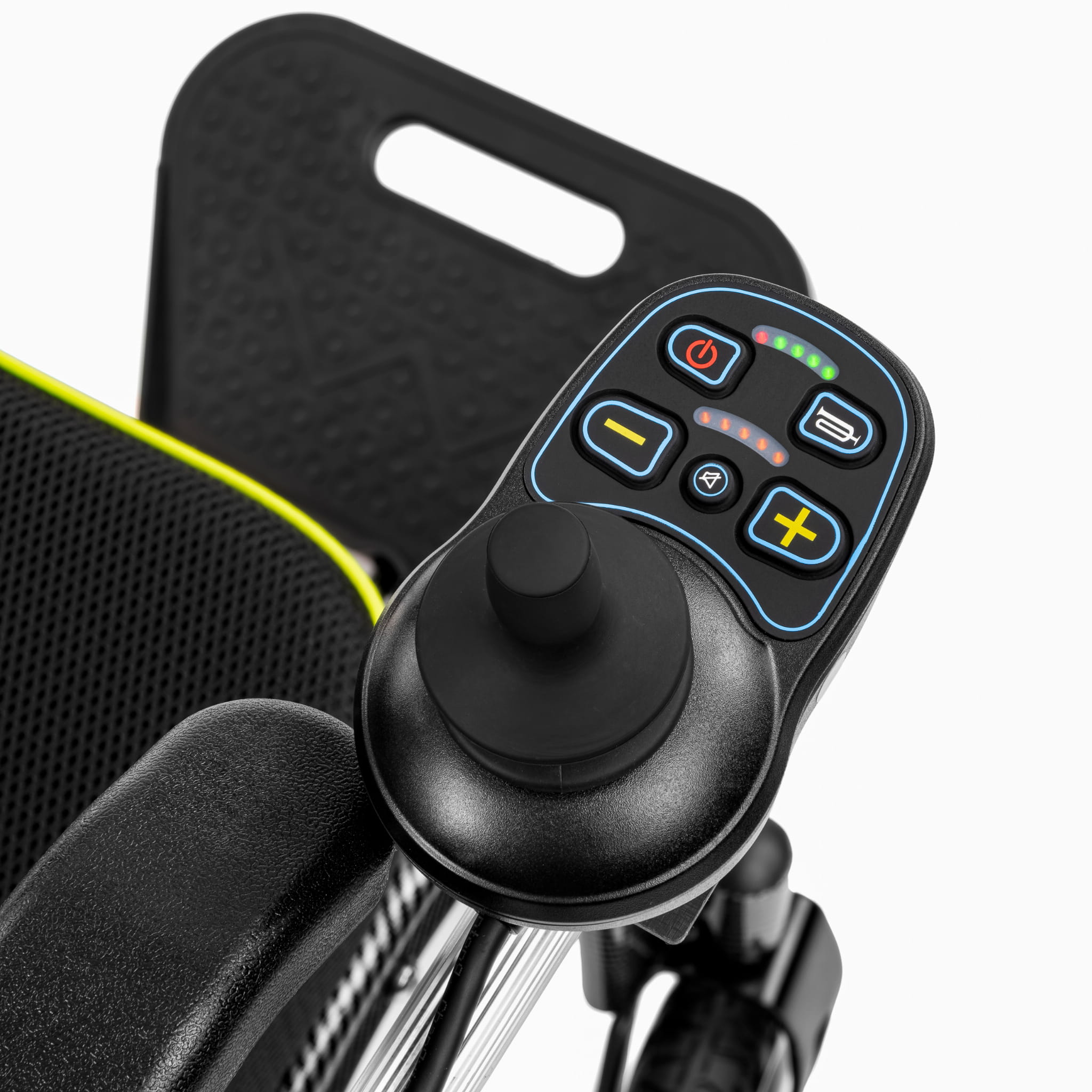 - Intuicyjny moduł sterowania – Joystick, regulacja prędkości, klakson, wskaźnik naładowania baterii oraz podświetlane przyciski zapewniają pełną kontrolę nad pojazdem.