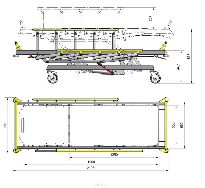 - Blat wózka wykonany z przeziernej płyty HPL, umożliwiającej wykonywanie badań RTG bez konieczności przesuwania pacjenta.