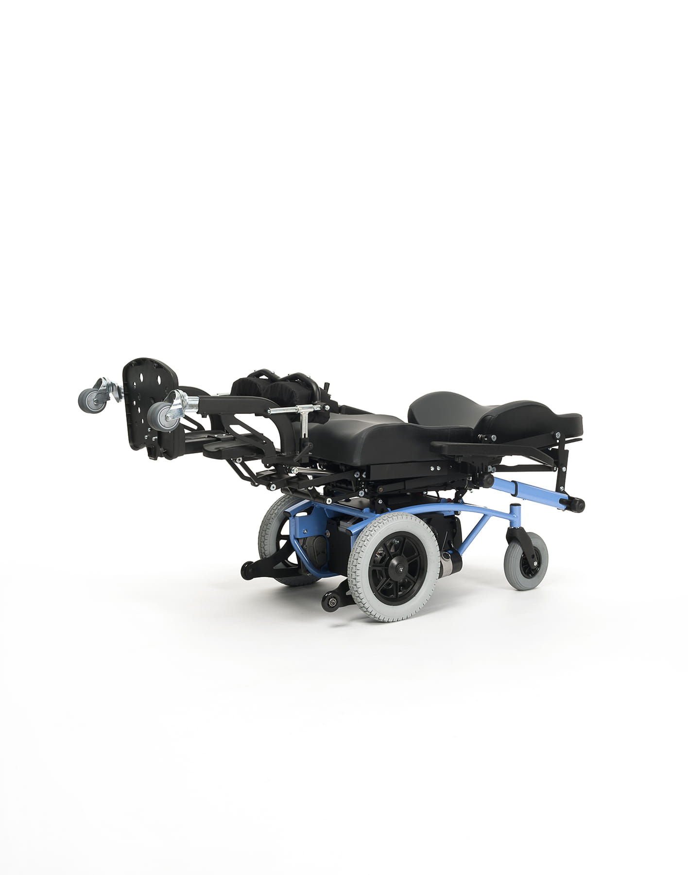 Wózek przez swój kompaktowy wygląd, duże koła napędowe przednie gwarantuje minimalny promień skrętu. Doskonale nadaje się do poruszania się w małych pomieszczeniach. Przy rozłożeniu do pozycji leżącej podłokietniki obniżają się poniżej linii siedziska co ułatwia transfer na łóżko i z łóżka na wózek.