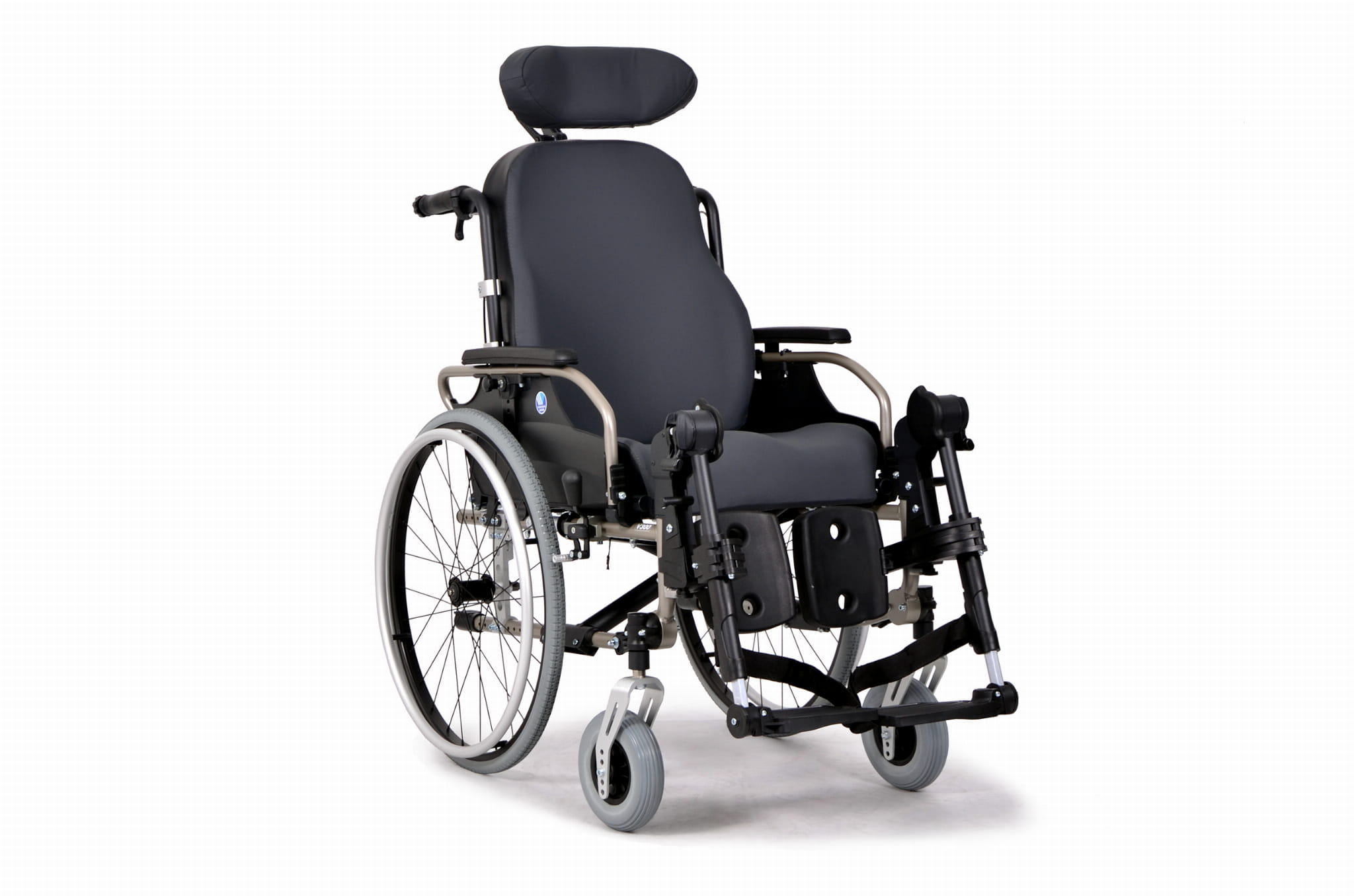 - Podnóżek regulowany z podparciem pod łydki typu ORTHO. Charakteryzuje się tym, że można nie tylko ustawić inny kąt ale także można dokładnie wyregulować pozycje ułożenia poszczególnych podparć , które są bezpośrednio odpowiedzialne za prawidłową postawę osoby siedzącej w wózku jak i jej prawidłową stabilizację:
