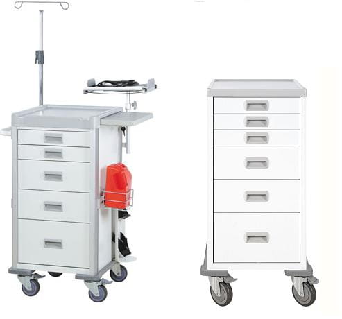 Wózek zabiegowy serii NC jest wyposażony w regulowany stojak na kroplówki i jest wyposażony w aluminiowe zderzaki, które integrują poręcze do elastycznego mocowania akcesoriów, aby pomieścić akcesoria, takie jak zestaw pojemników na ostre przedmioty, pojemnik na odpady i wiele miejsc do przechowywania w sytuacjach wymagających szybkiego leczenia dla ogólnych potrzeb pacjenta.